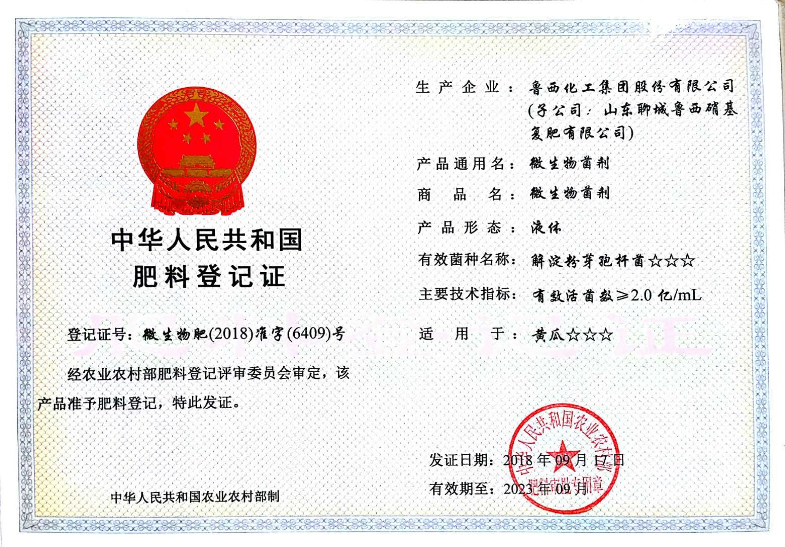 10月7日,收到了農(nóng)業(yè)農(nóng)村部肥料評審登記管理處寄來的魯西集團(tuán)農(nóng)業(yè)用微生物菌劑肥料登記證書,共涉及兩個菌種:解淀粉芽孢桿菌、多粘類芽孢桿菌。登記證號分別為“微生物肥(2018)準(zhǔn)字(6409)號”、“微生物肥(2018)準(zhǔn)字(6410)號”。登記證有效期至2023年9月。