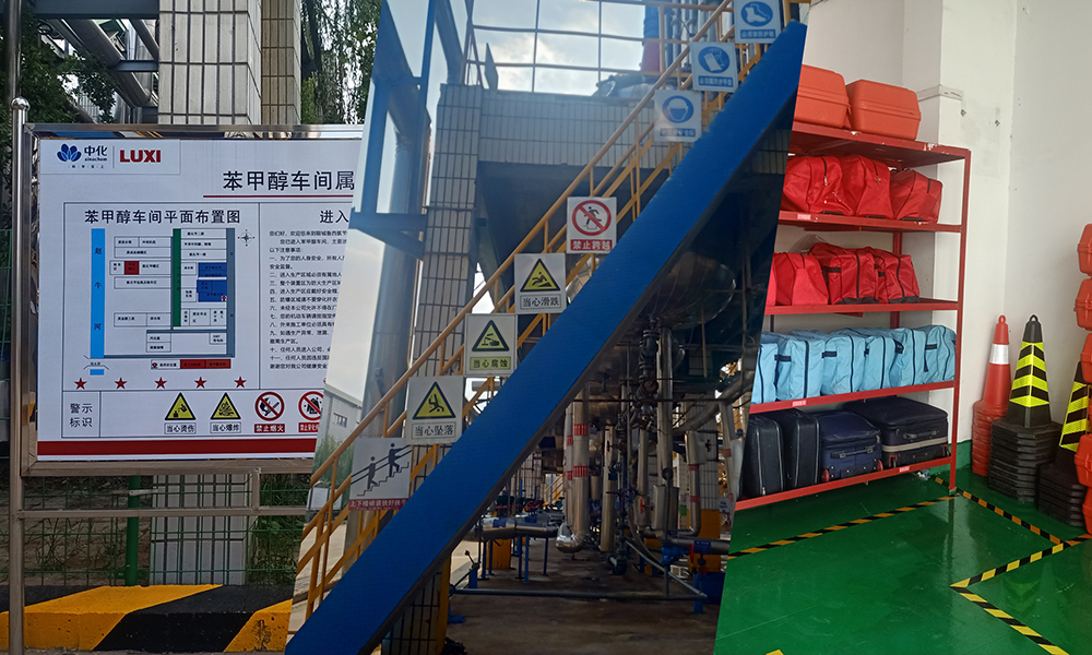 走進氯化芐事業部生產區,各類管理信息映入眼底。裝置主入口處設置了包含企業簡介、廠區平面布置圖、進入生產區域勞動防護用品要求等信息的宣傳欄,在主干道兩側醒目位置設置了企業HSE管理信息公告欄,信息公示屏正在公開循環展示企業安全里程碑及環保信息。在氯化鈣車間檢修現場,各類工器具均粘貼了合格標識,具有檢驗人、檢驗日期及檢驗結果等相關信息?,F場氣瓶及托架已經按照標準要求涂色,氣瓶粘貼著安全警示標簽,瓶身也采用標牌標明了氣瓶狀態。來到應急站,室內使用貼地膠帶、油漆、名稱標識等方式對應急物資進行了定置擺放,視線之內物品放置整齊有序、取用方便、符合規范。